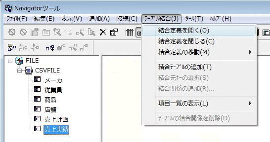 結合定義を行う結合元のテーブルを選択した状態で、[テーブル結合]-[結合定義を開く]を選択します。
