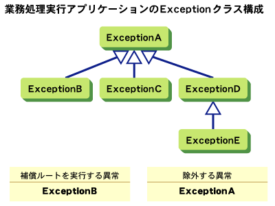 Javaの場合、補償ルートを実行する異常と除外する異常に指定した例外は、派生クラスも対象となります。