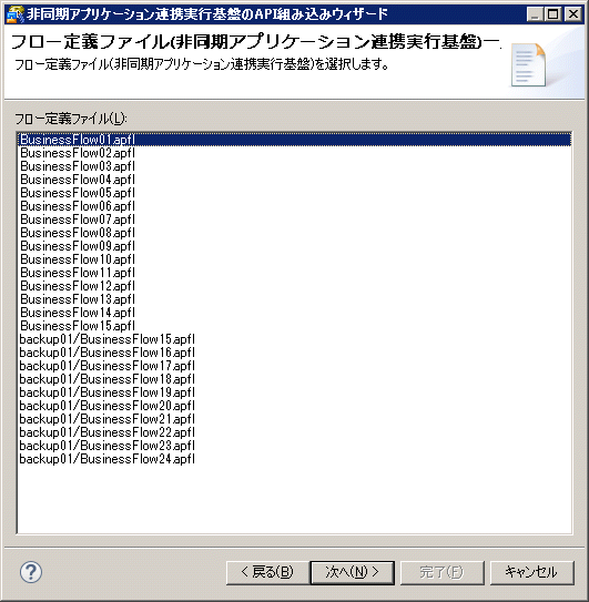 [非同期アプリケーション連携実行基盤のAPI組み込み]ウィザードが起動し、[フロー定義名選択]画面が表示されます。