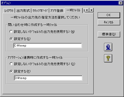 一時ファイルの保存先の指定は、オプション画面で行います。[一時ファイル]タブの[問い合わせ時に作成する一時ファイル]、[アプリケーション連携時に作成する一時ファイル]を指定します。