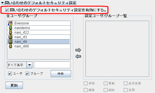 設定するフォルダをツリービューで選択し、[詳細]タブの問い合わせのデフォルトセキュリティ設定をズームインすると、デフォルトセキュリティを設定する画面が表示されます。