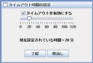 タイムアウト時間を5分から120分の間で(5分単位に)指定します。初期設定は、20分です。