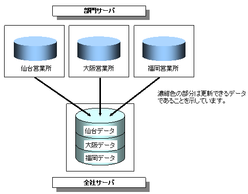 この例では、各営業所のサーバが複写元システム、全社サーバが複写先システムになります。