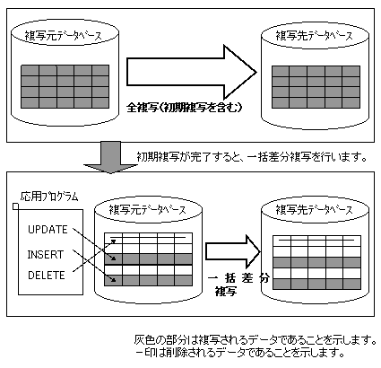全複写は、主に複写先データベースの初期創成のために行います。また、レプリケーションの運用を変更したときなどに、複写先データベースを再創成する目的で行うこともあります。複写先データベースの初期創成のために行う全複写を“初期複写”といいます。