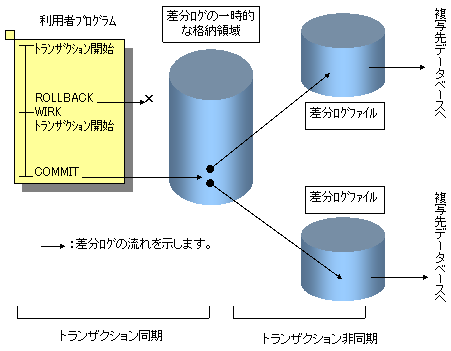 差分ログは、複写元データベースを更新する利用者プログラムの更新系SQLを実行した時点で、トランザクションと同期して、差分ログを一時的な格納領域に格納されます。ただし、トランザクションがロールバックされた場合は、格納された差分ログは無効となります。