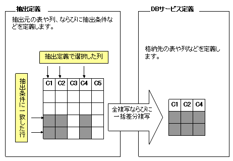 一方、抽出したデータを格納するために、複写先データベースの表や列を定義することを“DBサービス定義”といいます。DBサービス定義は、LinkexpressのDB連携機能の機能です。詳細は、“Linkexpress 運用ガイド”を参照してください。