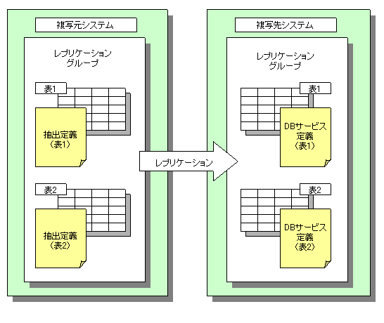 また、複数の抽出定義および複数のDBサービス定義をレプリケーショングループとしてグループ化して定義することで、グループ単位のレプリケーションを行うことができます。