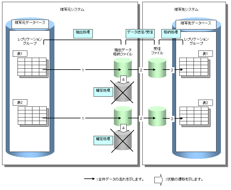 グループ単位のレプリケーションでの全複写業務のデータの流れを以下に示します。