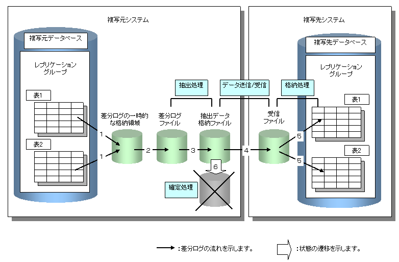 グループ単位のレプリケーションでは、差分ログはレプリケーショングループ単位で複写先データベースに格納されます。すなわち、1回の格納処理で、レプリケーショングループに属するすべての表に差分ログが格納されます。