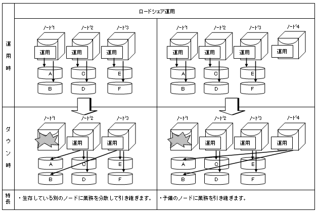 ノードがダウンした場合は、生存している別のノードに業務を分散して引き継ぎます。処理を引き継いだノードの処理量が増加するため、処理量に応じた性能になります。
