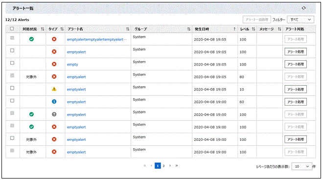 プール状況画面から[アラート]ボタンをクリックすると、アラート一覧(すべて)画面が表示されます。