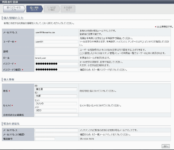 利用者情報を入力し、[次へ]ボタンをクリックします。