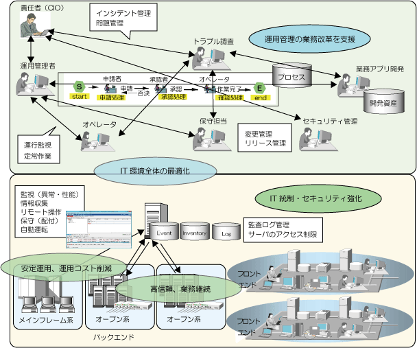 業務の再編、企業統合、企業間連携などにより、企業のIT環境は、ダイナミックに変化、柔軟に連携できることが求められ進化してきております。反面、情報システムの運用管理は、より複雑さ、困難さが増大しております。さらに、内部統制やITガバナンスの強化に対する要請が強くなっています。