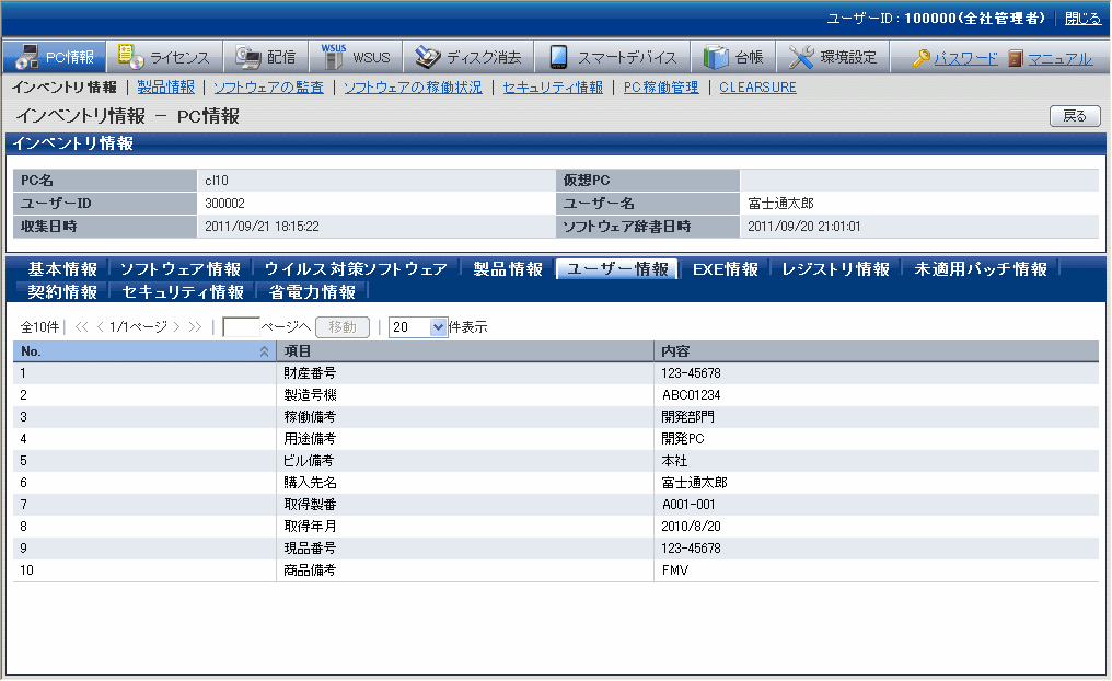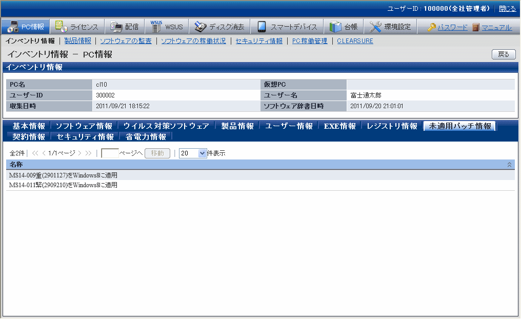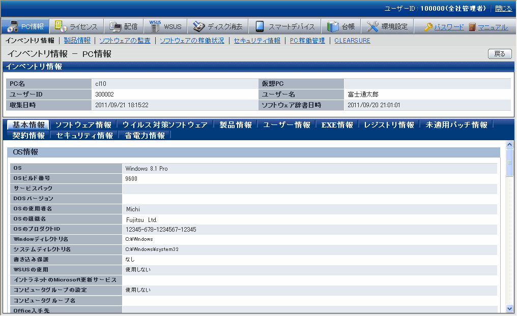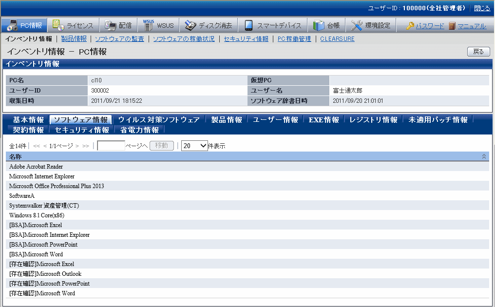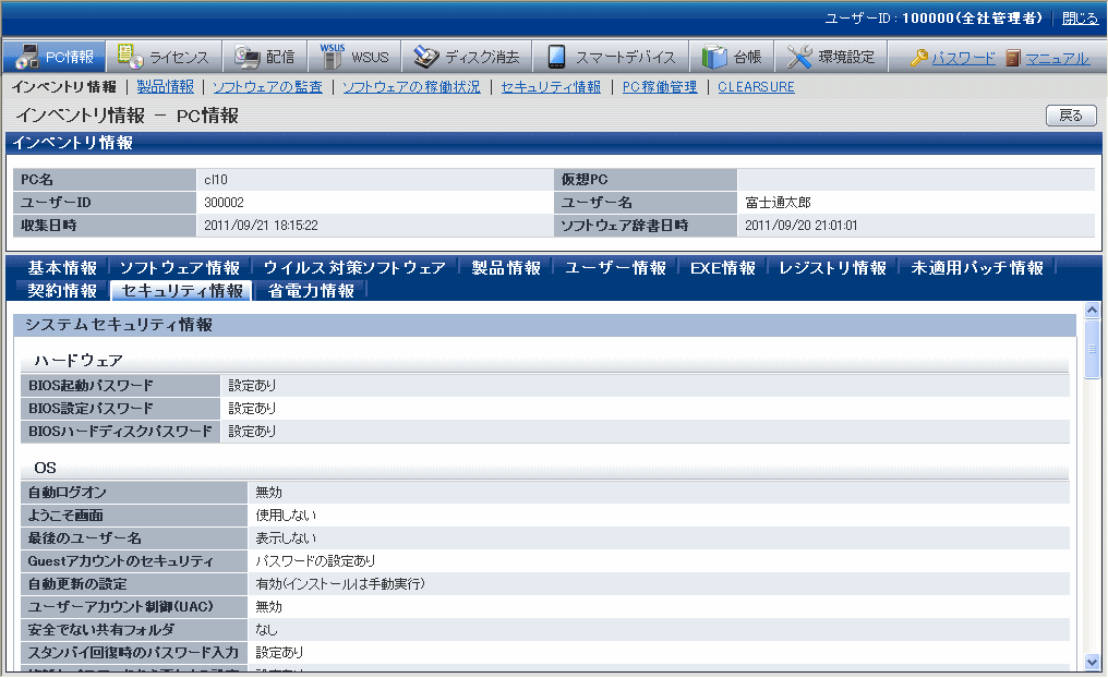 これらの情報は、メインメニューの[PC情報]-[インベントリ情報]画面で表示されます。