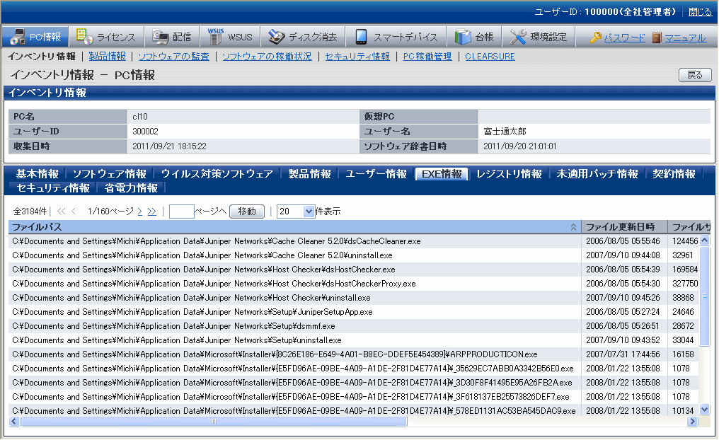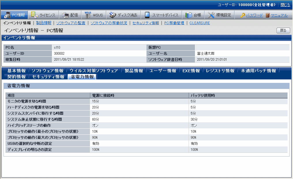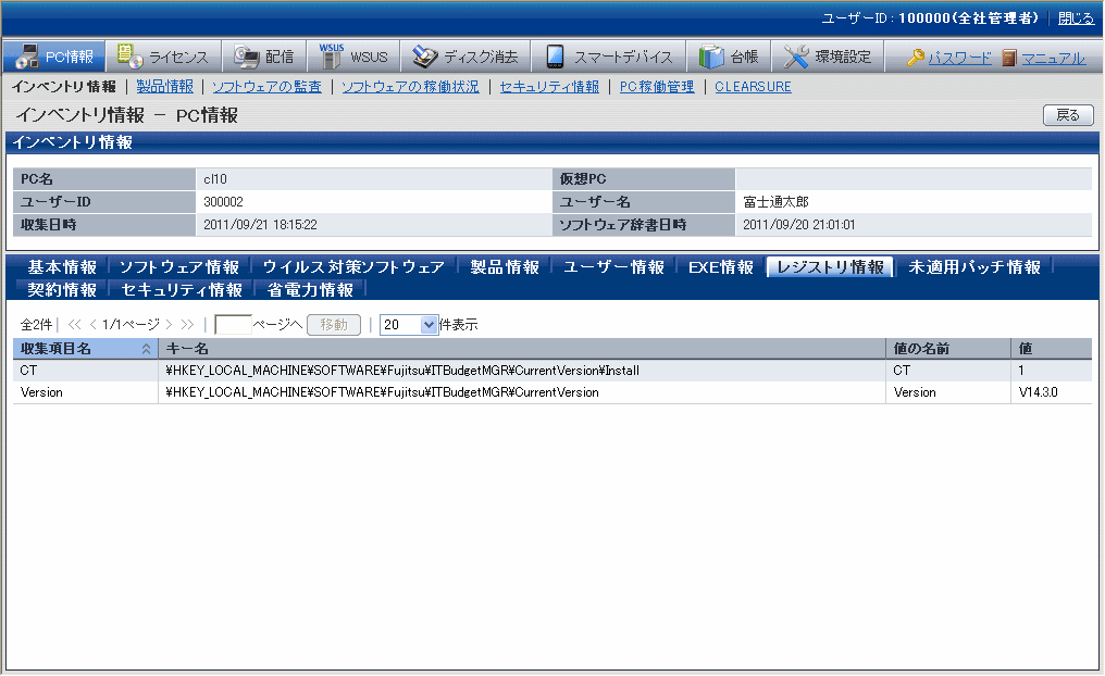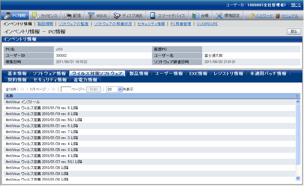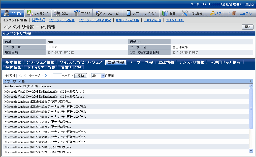 これらの情報は、メインメニューの[PC情報]-[インベントリ情報]画面で表示されます。