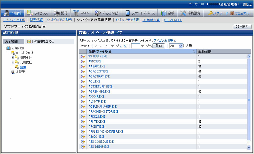 ソフトウェア稼働状況は、メインメニューの[PC情報]-[ソフトウェアの稼働状況]画面で表示されます。