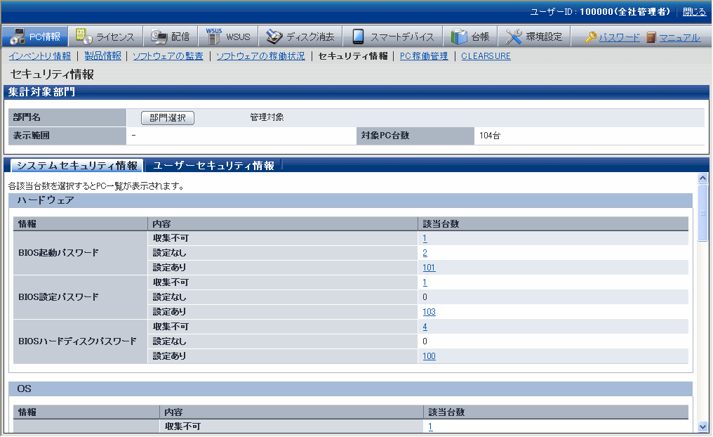 セキュリティ情報(システムセキュリティ情報とユーザーセキュリティ情報)は、使用しているOSによって、収集可能なセキュリティ情報が異なり、確認できる項目が異なります。