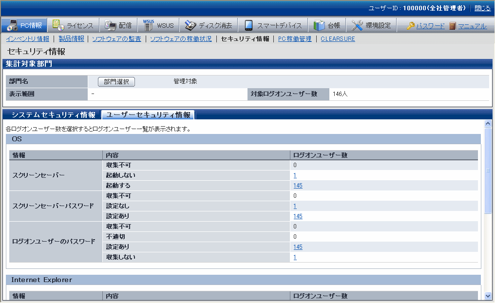 セキュリティ情報は、メインメニューの[PC情報]-[セキュリティ情報]画面で表示されます。
