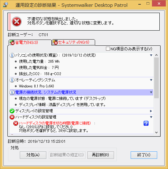 クライアント側で表示される省電力設定の診断結果画面を以下に示します。