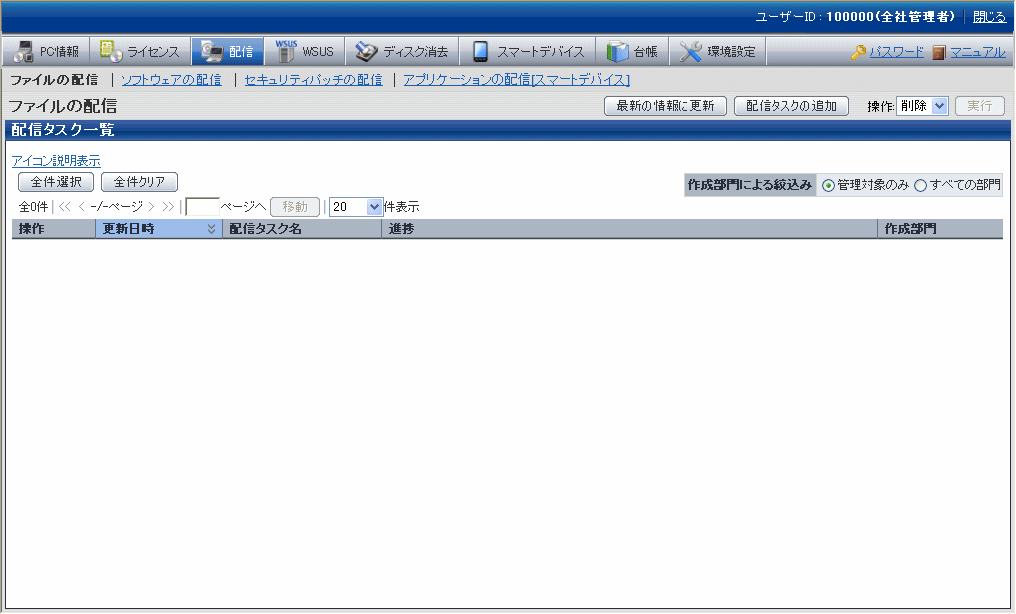 配信設定は、CSのメインメニューの[配信]-[ファイルの配信]の初画面で行います。