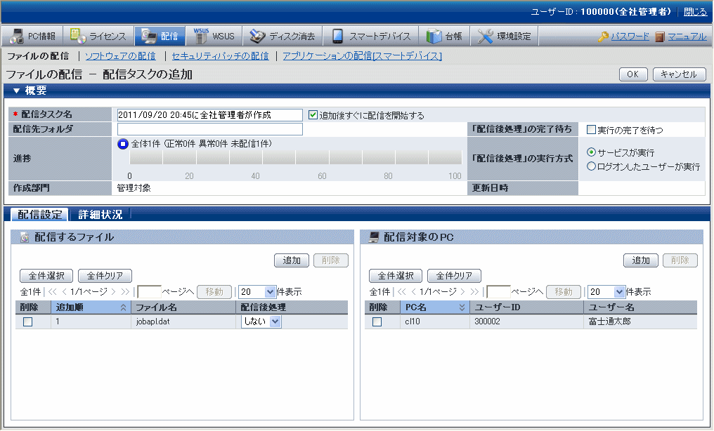 設定内容に応じて配信が開始され、配信ファイルがダウンロードされます。