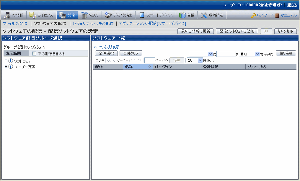 配信ソフトウェアの管理は、メインメニューの[配信]-[ソフトウェアの配信]-[配信用ソフトウェアグループの追加]-[配信ソフトウェアの設定]画面で行います。
