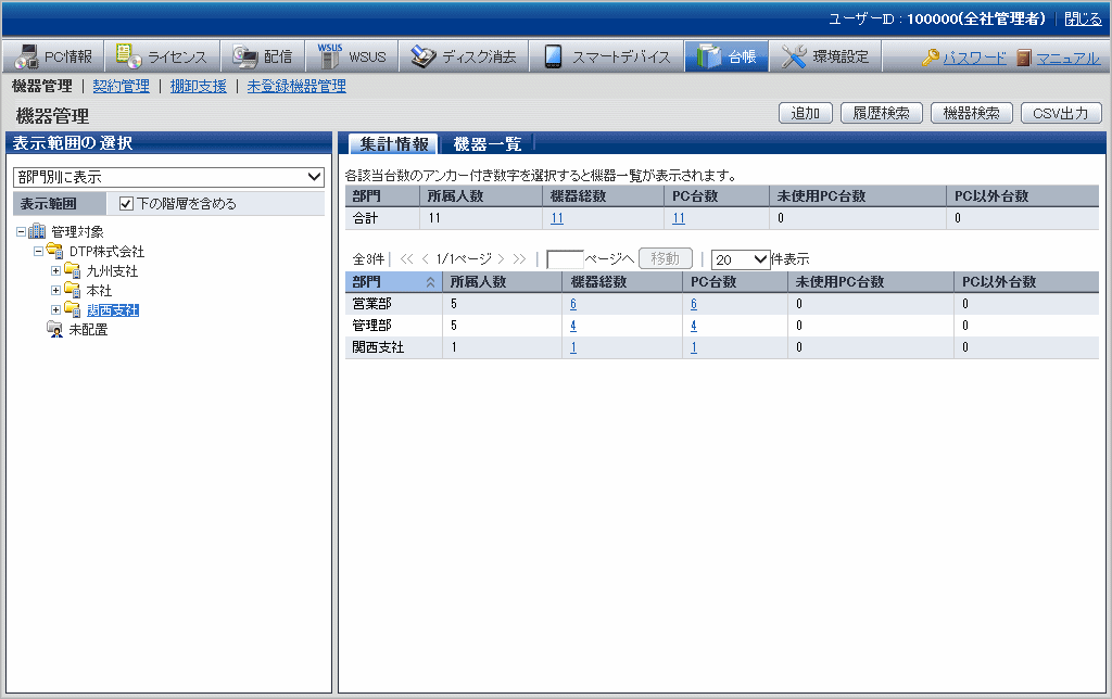 管理対象機器の全体数やPC台数などを、部門別/分類別/場所別に表示します。