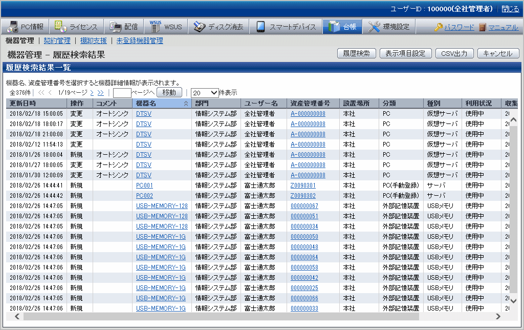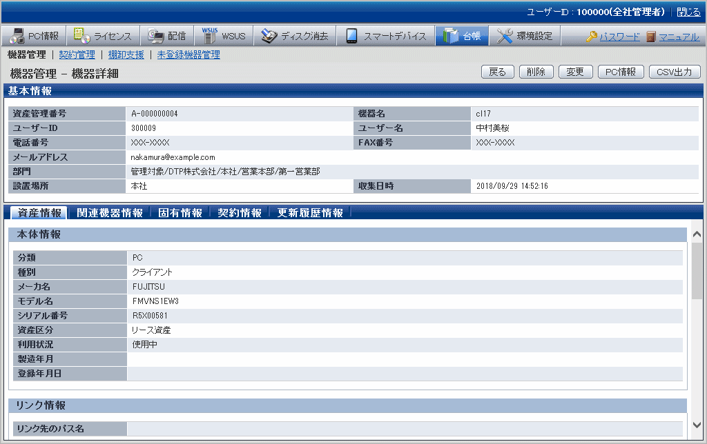 これらの情報は、「Desktop Patrol メインメニュー」の[台帳]-[機器管理]画面で表示されます。