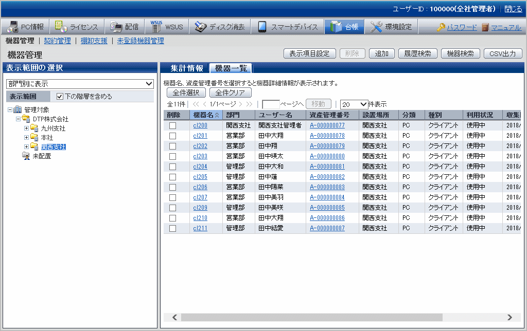 部門管理者の場合、機器情報を削除できるのは、自部門およびその配下の機器だけです。