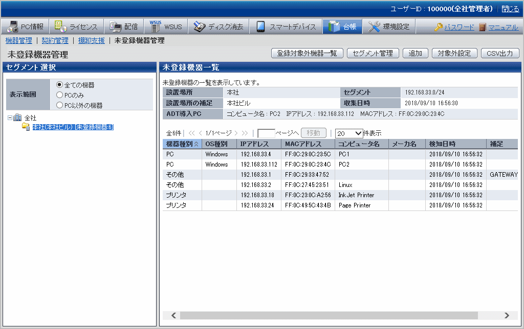 未登録機器の一覧を表示します。一覧表示は、セグメント単位で表示することができます。