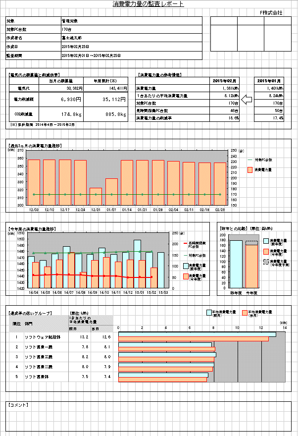 また、省電力監査の結果は、レポートとして出力し、正しく省電力対策が行われていることの証明書としても利用できます。