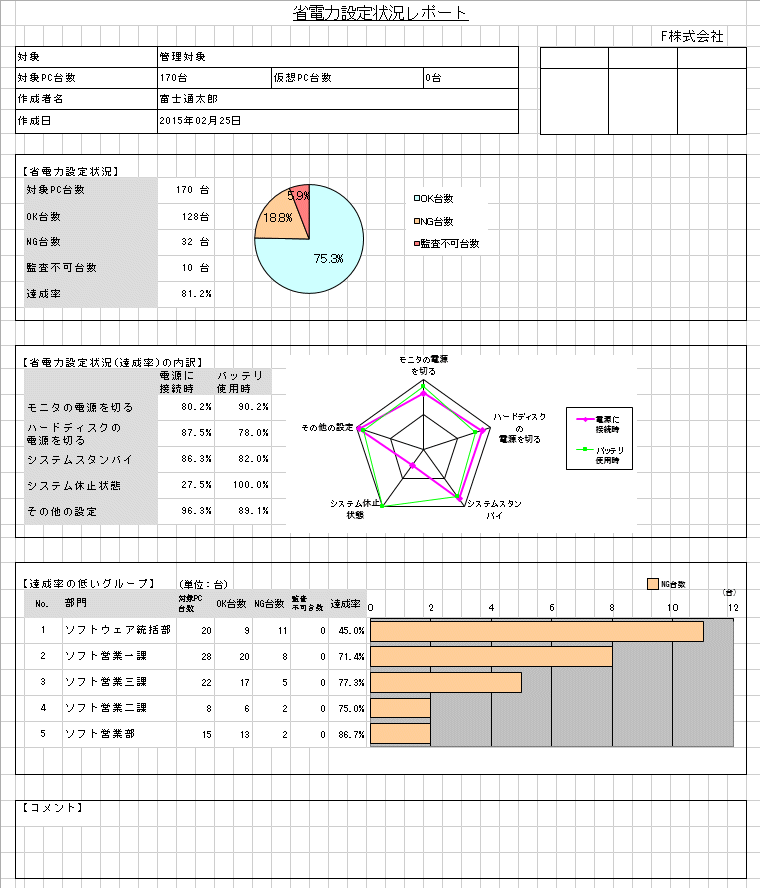省電力監査の結果として、省電力監査レポートを出力します。省電力監査レポートとは、省電力対策について運用状況やリスクのある部門/PCを把握・評価するために出力される監査/証明用レポートです。