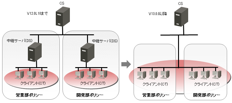 従来では動作ポリシーを変えるために、各拠点に複数の中継サーバを構築していましたが、PCを論理的なグループに所属させることにより、動作ポリシーを変えるための中継サーバは不要になります。
