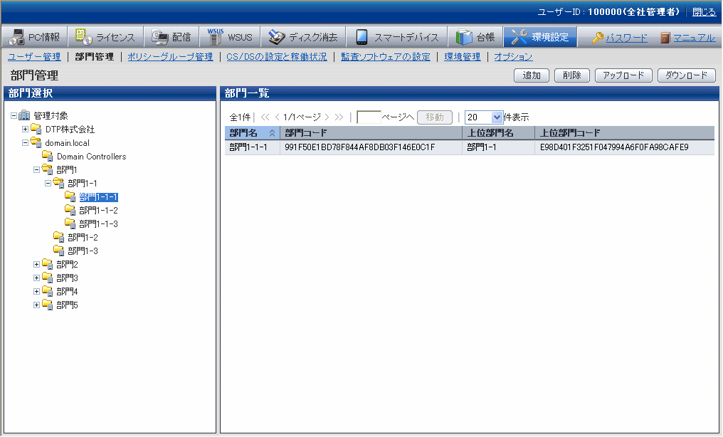 事業部、部、課などのような企業の部門であり、PCを利用するユーザーは通常部門に所属します。部門の登録および削除を行います。