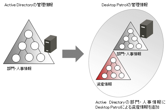 Active Directoryとは、ネットワーク上の各種資源(PCやプリンタ、ユーザー情報等)を効率よく管理するためのディレクトリサービスです。Desktop PatrolはActive Directoryと連携することにより、Active Directoryで管理している部門・人事情報に、Desktop Patrolによる資産情報を関連づけて管理できるようになります。また、Active Directoryの部門・人事情報からDesktop Patrolのマスタ管理情報を自動的に生成できるため、従来のように手作業によるDesktop Patrolのマスタ管理情報を作成する必要がなくなり、情報を一元管理する運用を行えます。