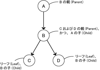 子 (Child) が存在しないオブジェクトCおよびオブジェクトDはリーフオブジェクト (Leaf Object) である。オブジェクトCおよびオブジェクトDは、オブジェクトBの子でもある。