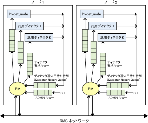 各ディテクタは1つ以上のリソースに関する情報を内部テーブルで管理します。ディテクタは内部テーブルに記録されている各RMSリソースを検索し、各RMSリソースの最新の状態を取得して、最新の状態と前回の状態を比較します。最新の状態と現在の状態が異なる場合、ディテクタは該当するRMSリソースタイプのディテクタ通知用待ち行列 (Detector Report Queue) により、BMに最新の状態を通知します。BMは、構成定義ファイルからの情報に基づいてリソースの状態に応じた処理を実行します。