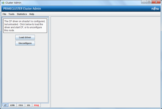 If CF is stopped on the initial connection node, the Cluster Admin main window appears with the CF options of Load driver or Unconfigure (see below.) The CF state must be UNLOADED or LOADED to start CF on a node.