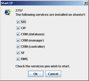 The Start CF services popup appears (see below.) By default all CF services that have been installed on that node are selected to be started. The contents of this list may vary according to the installed products.