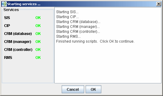 Click on the Ok button and a status popup appears with the results of each service start operation (see below.)
