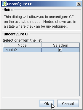 To unconfigure a CF node, first stop CF on that node. Then, from the Tools pull-down menu, click on Unconfigure CF. The Unconfigure CF pop-up display appears. Select the check box for the CF node to unconfigure, and click Ok (see below.)