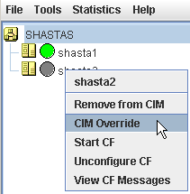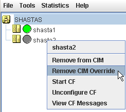The CIM Override option causes a node to be ignored when determining a quorum. A node cannot be overridden if its CF state is UP. To select a node for CIM Override, right-click on a node and choose CIM Override (see below.)
