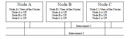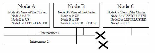 Now suppose that there is a cluster partition in which the connections to Node C are lost. The result is shown in the following figure.