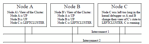 If the break point is set by the kernel debugger to suspend the operation of OS kernel, the heartbeat of CF will stop. In the following figure, Node C was placed in the kernel debugger too long so it appears as a hung node. Nodes A and B decided that Node C's state was LEFTCLUSTER.