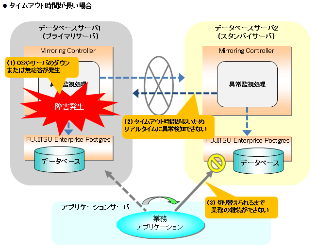 OSやサーバのダウンおよび無応答は上記の通りタイムアウトによる監視を行っています。そのため、チューニングが正しく行われていないと、サーバが健全な状態にもかかわらず誤ってスプリットブレインを発生させる危険性があります。