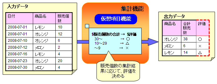 以下は、商品の販売個数の集計結果によって、仮想項目として各商品の評価情報を付加する例です。