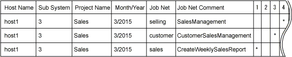 Host Name,Sub System,Project Name,Month/Year,Job Net,Job Net Comment,1,2,3,4,5,6,7,8,9, 10,11,12,13,14,15,16,17,18,19,20,21,22,23,24,25,26,27,28,29,30,31 host1,3,Sales,3/2014,selling,SalesManagement, , , ,*, , , , , , , ,*, , , , , , ,*, , , , , , ,*, , , , , host1,3,Sales,3/2014,customer,CustomerSalesManagement, , ,*, , , , , , , , ,*, , , , , , ,*, , , , , , ,*, , , , , host1,3,Sales,3/2014,sales,CreateWeeklySalesReport, *, , , , , , ,*, , , , , , ,*, , , , , , , ,*, , , , , ,*, ,