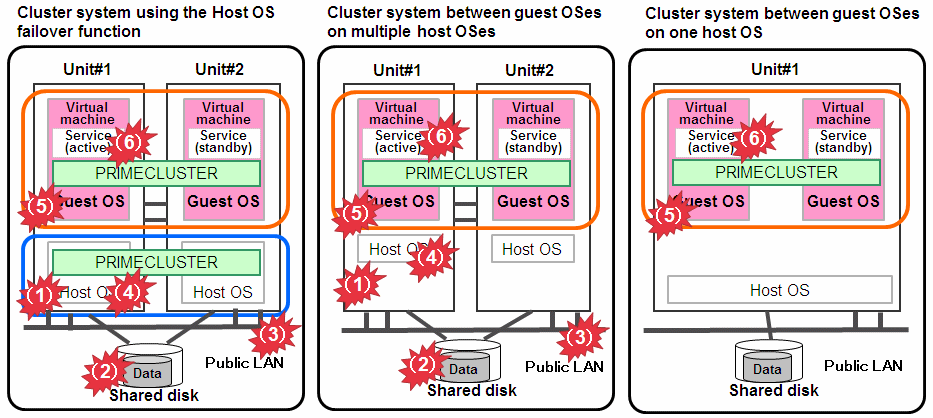 Cluster system between guest OSes with the Host OS failover function | Cluster system between guest OSes on multiple host OSes | Cluster system between guest OSes on one host OS | Cluster system between guest OSes on multiple compute nodes | Cluster system between guest OSes on one compute node | Cluster system between guest OSes on multiple ESXi hosts | Cluster system between guest OSes on one ESXi host | ||