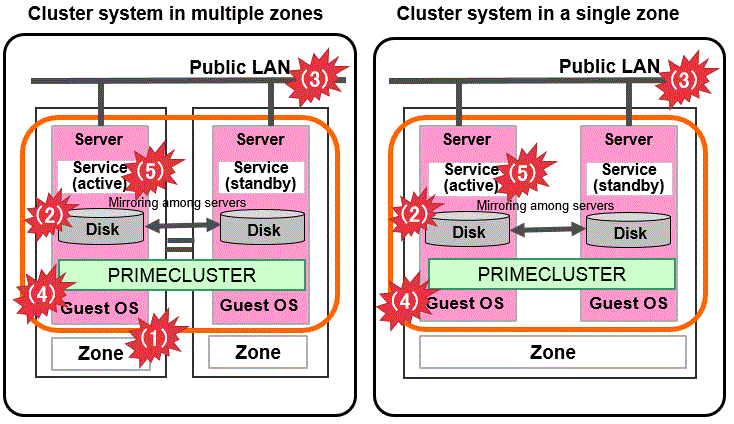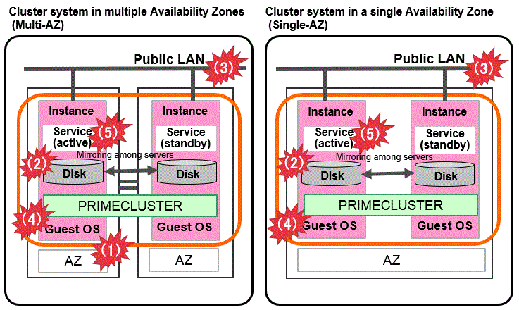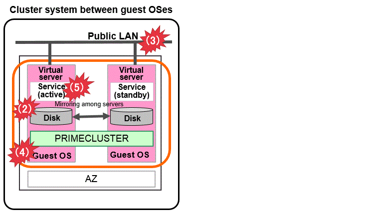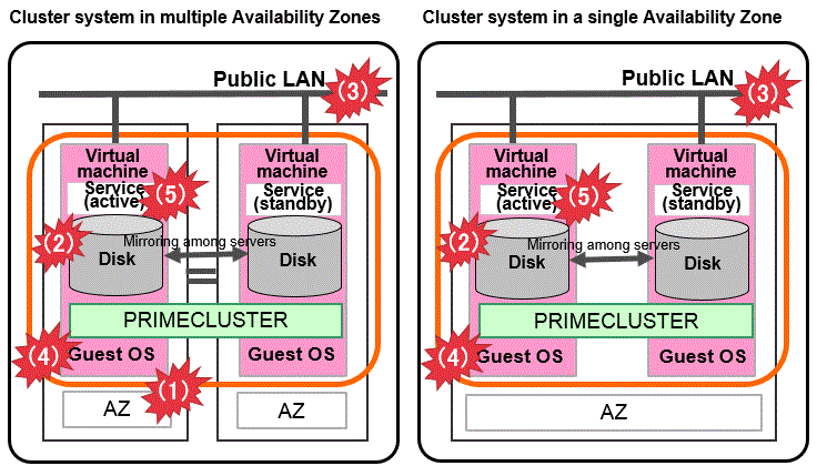Cluster system between guest OSes | Cluster system in multiple zones | Cluster system in a single zone | Cluster system between Bare Metal servers | Cluster system in multiple Availability Zones (Multi-AZ) | Cluster system in a single Availability Zone (Single-AZ) | Cluster system in multiple Availability Zones | Cluster system in a single Availability Zone | |