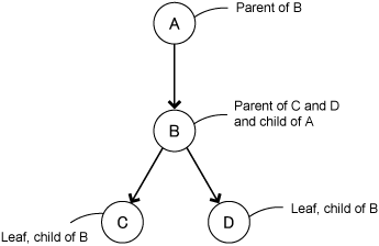 Object B requires the resources C and D to function properly, making B a parent of C and a parent of D.